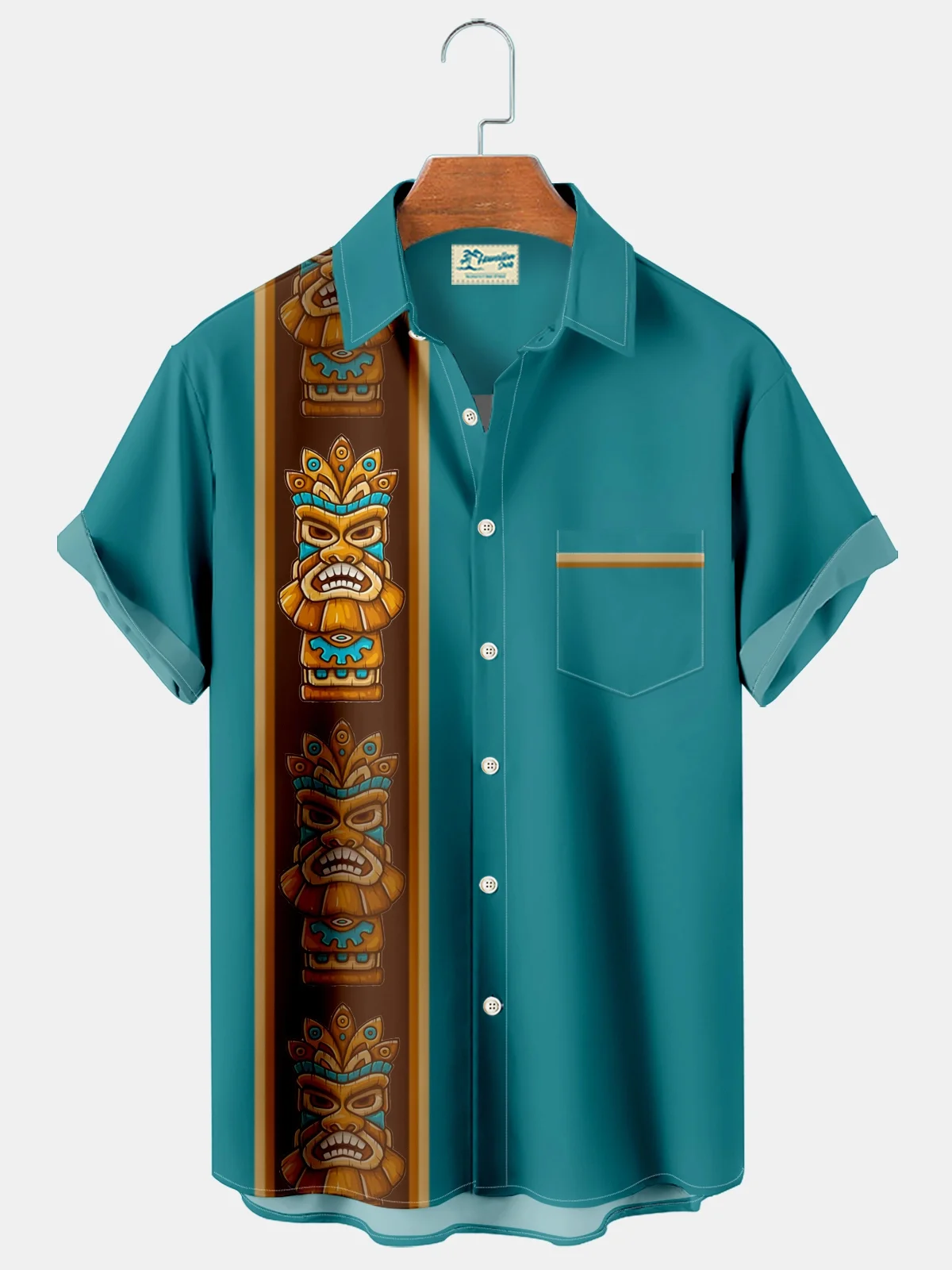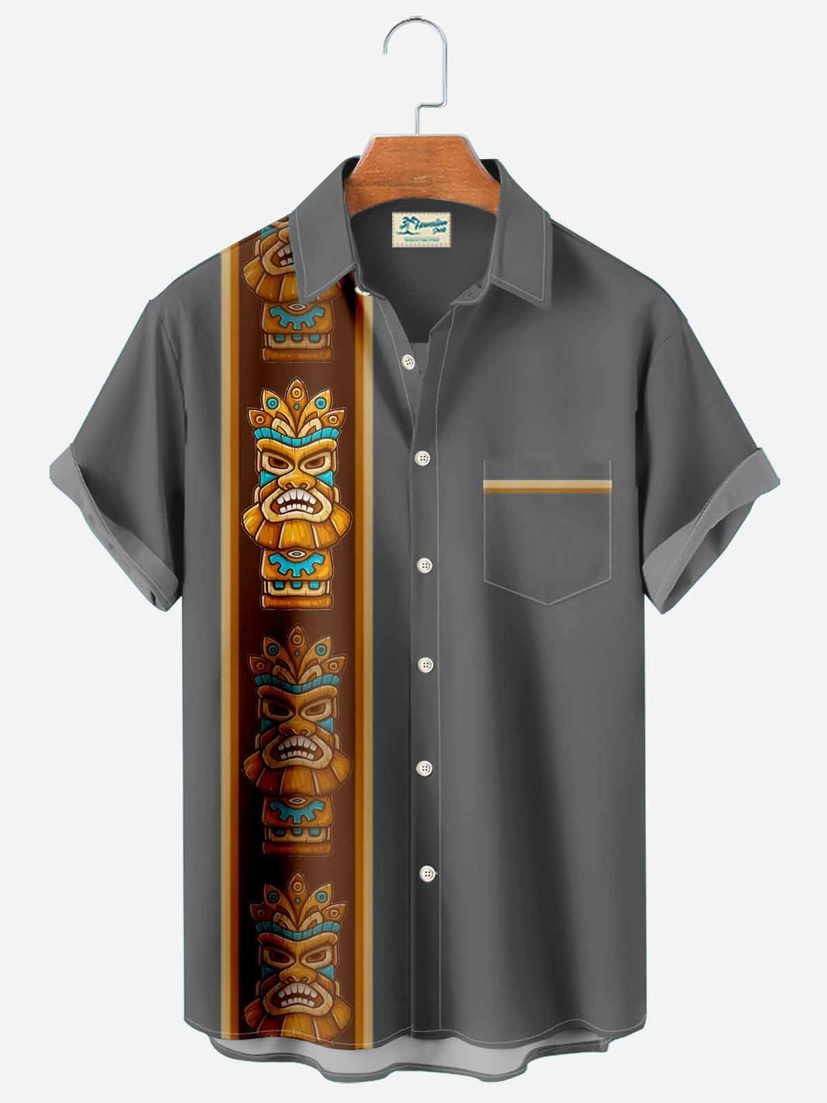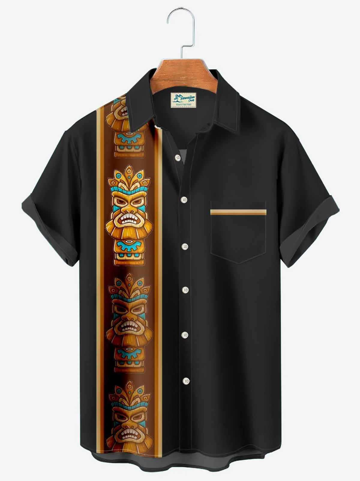 Royaura Vintage bowling tiki totem men's pocket casual button shirt